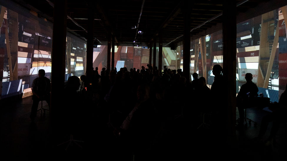 Performance mit übergrossen Videoprojektionen, 360° Live Musik und rollenden Stühlen für das Publikum.